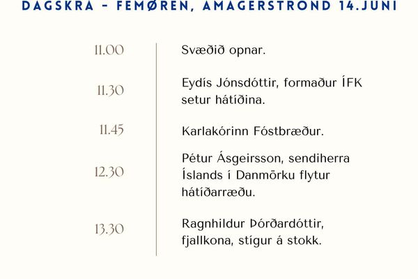 Þjóðhátíðardagur Íslendinga í Danmörku verður haldinn hátíðlegur laugardaginn 14. júní á Femøren, Amagerströnd. Svæðið opnar klukkan 11:00 og formleg dagskrá hefst upp úr klukkan 12:00.