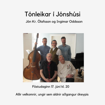 Jónshúsi. Tónlistarmenn frá Íslandi og Danmörku leika með. Tónlistarsafn Jóns Kr. er 23ja ára þann dag og hljómsvei