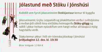 Kvöldið sem fyrsti jólasveinn Stekkjastaur kom til byggða. Jólasveinarnir, Grýla, Leppalúði og jólakötturinn verða í sviðsljósinu á meðan þið hin sötrið hinar einStöku heimagerðu Stöku – glögg og raðið í ykkur heitum eplaskífum sem hægt verður að kaupa á mjög hagstæðu verði.