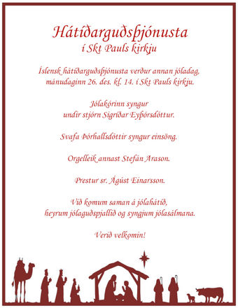Íslensk hátíðarguðsþjónusta verður annan jóladag, mánudaginn 26. des. kl. 14. í Skt Pauls kirkju.
