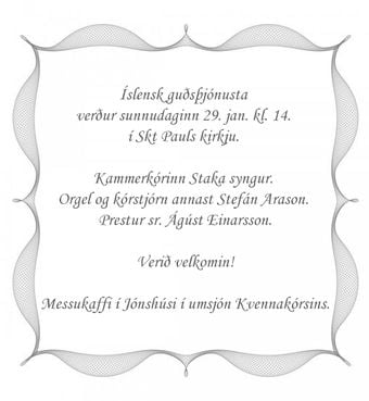 Íslensk guðsþjónusta sunnudaginn 29. janúar klukkan 14:00.