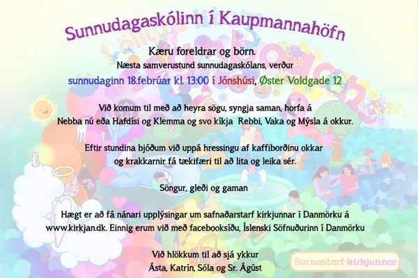 Eitt af föstum liðum sem eru á dagskrá Jónshúss er Sunnudagaskólinn. Það eru þær stöllur Ásta, Katrín og Sóla sem standa að sunnudagaskólanum í samstarfi við íslenska prestinn í Danmörku sr. Ágúst Einarsson.